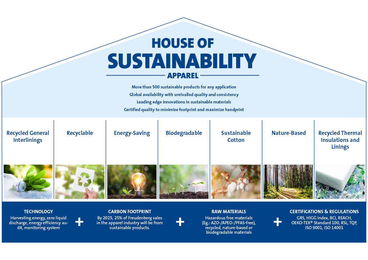 The global shift towards greater sustainability and transparency in the apparel industry is driving many companies and suppliers to develop alternative approaches and solutions. With the House of Sustainability, Freudenberg Apparel is offering a holistic concept for a sustainable future in the apparel industry.