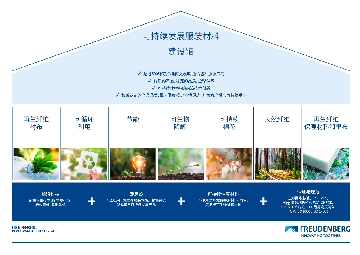 全球服装行业正朝着提高可持续发展和透明度的方向前进,这也推动更多服装品牌和供应商致力于开发各种替代解决方案。可持续发展服装材料建设馆的推出,标志着科德宝高性能材料集团全球服装事业部为服装行业未来的可持续发展提供完整的解决方案。